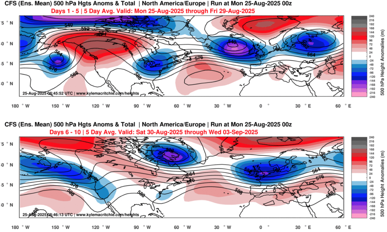 La integración del ex-huracán Erin en la circulación general europea estos días va a provocar un buen vaivén en la ondulación e intensidad del chorro polar en el Atlántico norte, abriendo la puerta a la llegada de los primeros cambios otoñales a gran parte de Europa occidental este final de agosto. En el caso de España, lo notaremos sobre todo con bajada de temperaturas y algunas lluvias repartidas por el norte esta semana, así como un breve episodio de tormentas en las regiones del noreste peninsular con posibilidad de algunos daños locales debido al granizo.